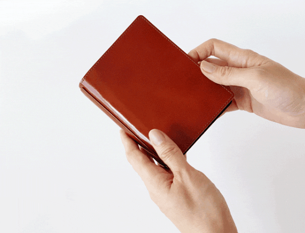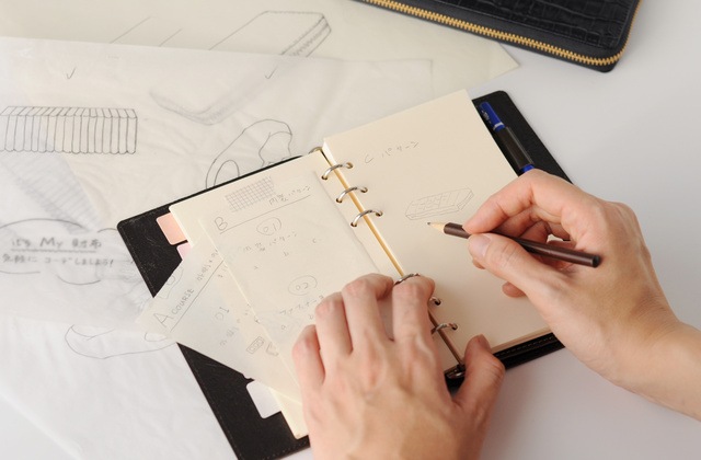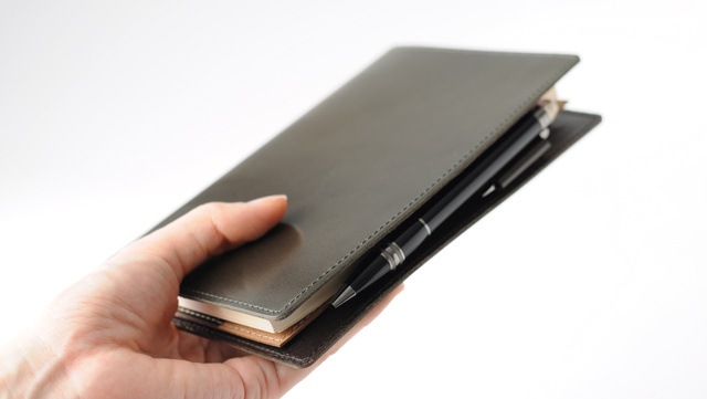 光の加減や角度で色味が微妙に違う、奥行きのある表革(牛革)と色移りしにくい顔料仕上げの裏革(豚革)のコンビで書き心地はもちろん、周りの目も引く一品に仕上げました。