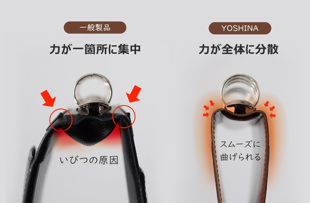 異なる特性の革を使用することにより、硬すぎず、軟らか過ぎず、ちょうど良い「しなやかさ」を実現できます。また、それぞれの革が引っ張りあうことで、製品の耐用性も革一枚のみと比べ変形しにくくなっています。