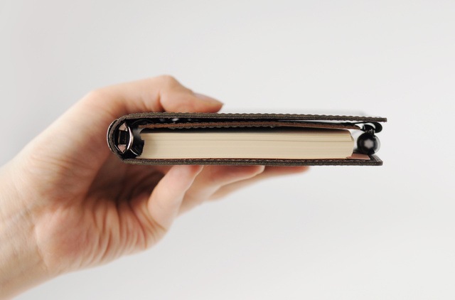 バックプレートとリングで貼り合わせた一枚革を挟む構造により、完全に開いた状態で使用できます。また、デスクがない環境では折り返した状態で使用可能です。